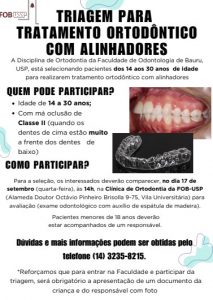 Os pacientes menores de 18 anos necessitam estar acompanhados de um responsável. O estudo é desenvolvido pela Disciplina de Ortodontia da Faculdade de Odontologia de Bauru da Universidade de São Paulo.
