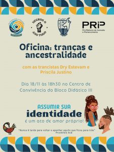 A oficina “Tranças e Ancestralidade” será realizada no dia 18 de novembro (terça-feira), às 18h30, no Centro de Convivência do Bloco Didático III do campus.